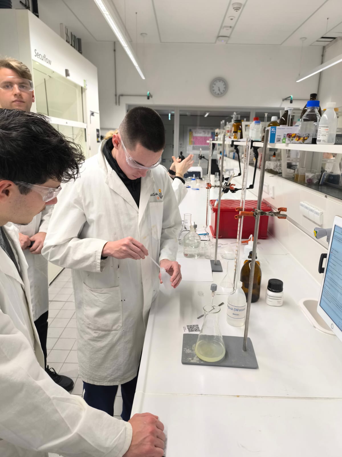 Der Unterricht in der Oberstufe wird ergänzt durch Lehrveranstaltungen, wie zum Beispiel der Besuch im Schülerlabor des Gläsernen Labors am Campus Buch zum Thema “Aminosäuren und Proteine” oder der Besuch im NatLab der FU zum Thema Säure-Base-Chemie. Gern in Erinnerung sind auch die Experimentalvorlesungen an der FU zum Jahresende. Zur Isolierung und zum Nachweis von Coffein aus Kaffee und Tee und zum Thema Duftstoffe war der Wahlpflichtkurs im Gläsernen Labor in Berlin Buch.