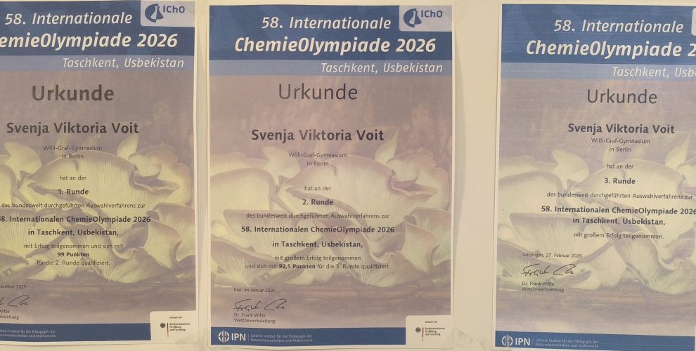 Im Rahmen des Deutschen Auswahlwettbewerbs für die 58. Internationale Chemie-Olympiade hat – zum wiederholten Male – Svenja Voit aus der 11. Jahrgangsstufe das Willi-Graf-Gymnasium vertreten. Und wie! Svenja, die erst im Oktober abermals für ihre Leistungen im Wettbewerb “Chemie, die stimmt!” ausgezeichnet wurde, erreichte mit Bravour die 3. Runde und damit einen einwöchigen Vorbereitungskurs der 50 besten Chemikerinnen und Chemikern Deutschlands in Göttingen!
