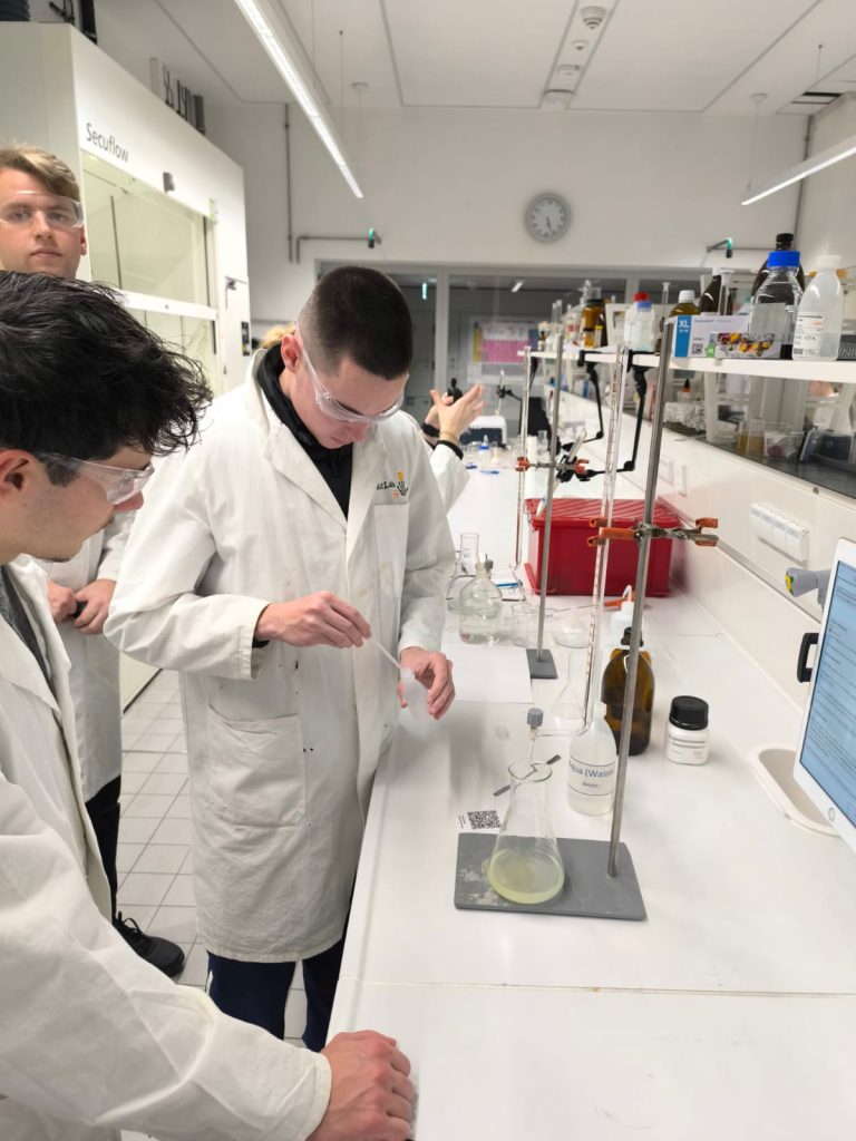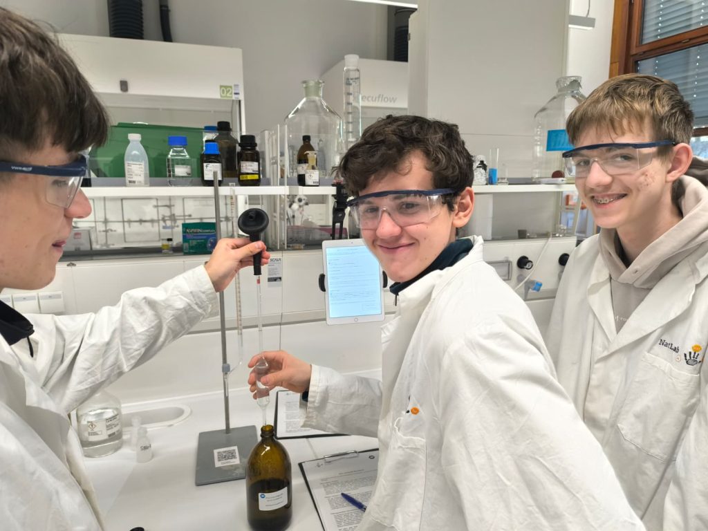 Der Chemie-Leistungskurs des 12. Jahrgangs hat an einem neuen Format des Natlabs der Freien Universität Berlin teilgenommen: In einem Umwelt-Mystery, in dem ein Fischsterben simuliert wurde, untersuchten die elf Schüler/innen des Q3-Kurses verschiedene Analysemöglichkeiten des Flusswassers durch Titrationen. Dabei wurden nicht nur die abiturrelevanten Experimente durchgeführt, sondern auch in einem spannenden Setting Rückschlüsse auf ökologische Auswirkungen getroffen. Vielen Dank an das Natlab-Team für den spannenden Nachmittag!